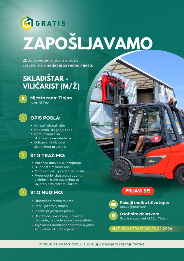 Tvrtka GRATIS d.o.o., regionalni lider u trgovini građevinskog materijala, zbog povećanja kvalitete usluge raspisuje natječaj za radno mjesto: SKLADIŠTAR – VILIČARIST (m/ž).