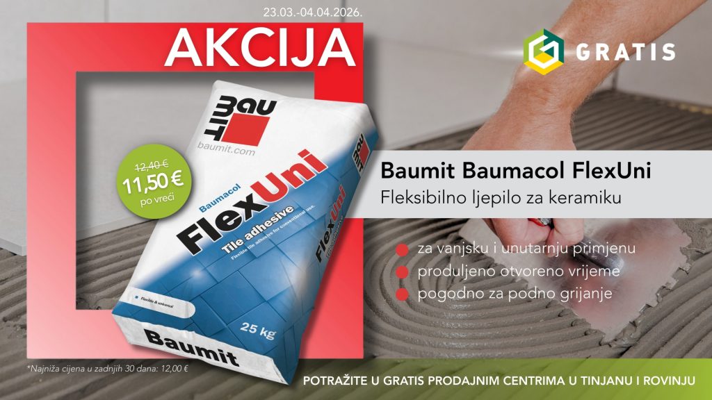 Baumit Baumacol FlexUni fleksibilno ljepilo za keramiku potražite po akcijskoj cijeni od 11,50 € po vreći (25 kg) u GRATIS prodajnim centrima u Tinjanu i Rovinju, gdje vas očekuje širok izbor materijala za gradnju, renoviranje i uređenje doma.