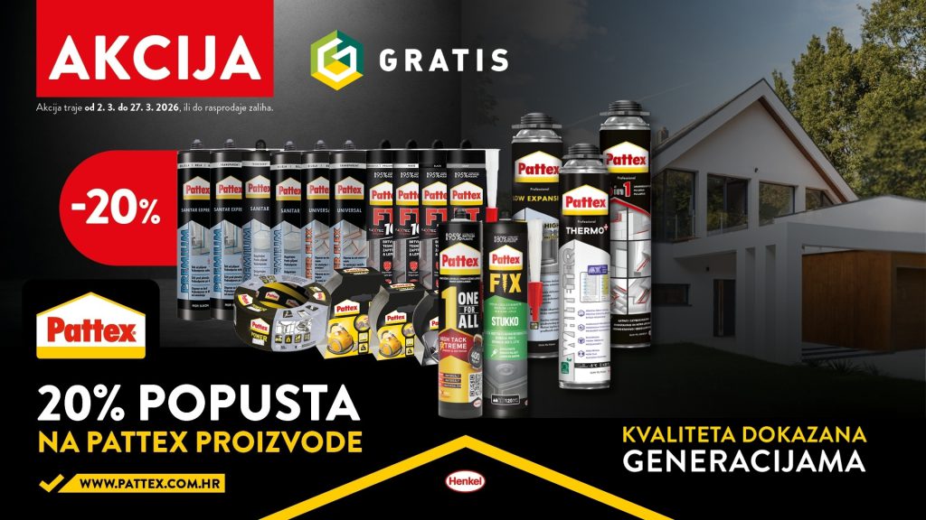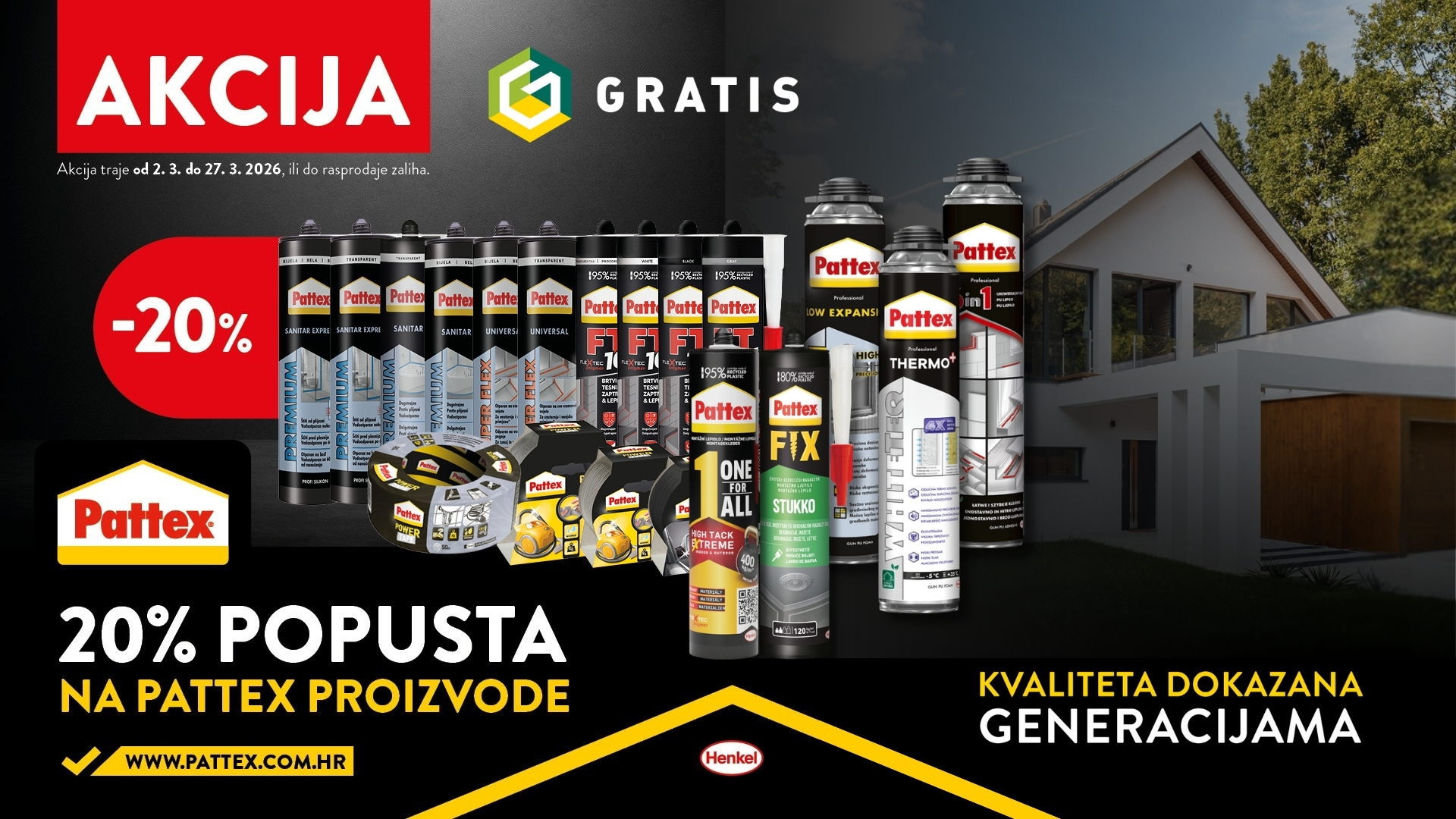 za montažu i popravke tu su Pattex proizvodi, a za dodatne uštede svratite u GRATIS gdje vas čeka 20% popusta na cjelokupni Pattex asortiman!